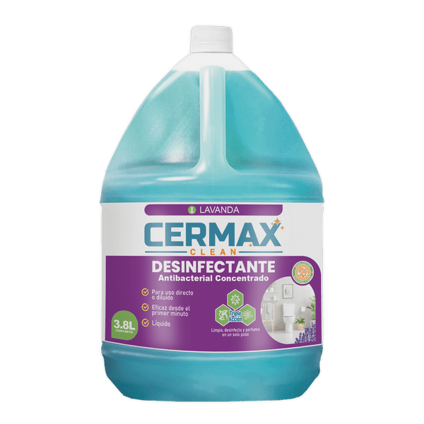 DESINFECTANTE CON AROMAS CERMAX es un producto antibacterial concentrado con fórmula de triple acción que limpia, desinfecta y deja un agradable aroma, eliminando el 99.999% de bacterias y hongos