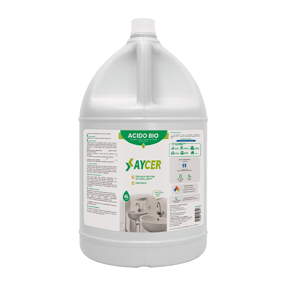 ÁCIDO BIO AYCER es un desincrustante y desinfectante a base de ácido orgánico, eficaz contra óxido, sarro e incrustaciones. No daña tuberías ni emite gases tóxicos. Ideal para cerámica, baños, griferías, inodoros y urinarios.