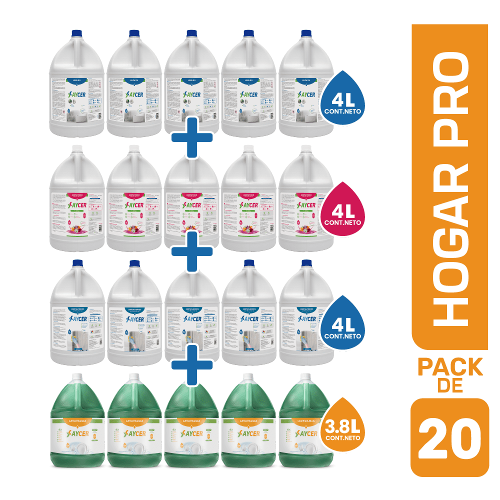 PACK HOGAR PRO – LEJÍA 5% 4L + LIMPIATODO 4L + LIMPIAVIDRIO 4L + LAVAVAJILLA 3.8 L
